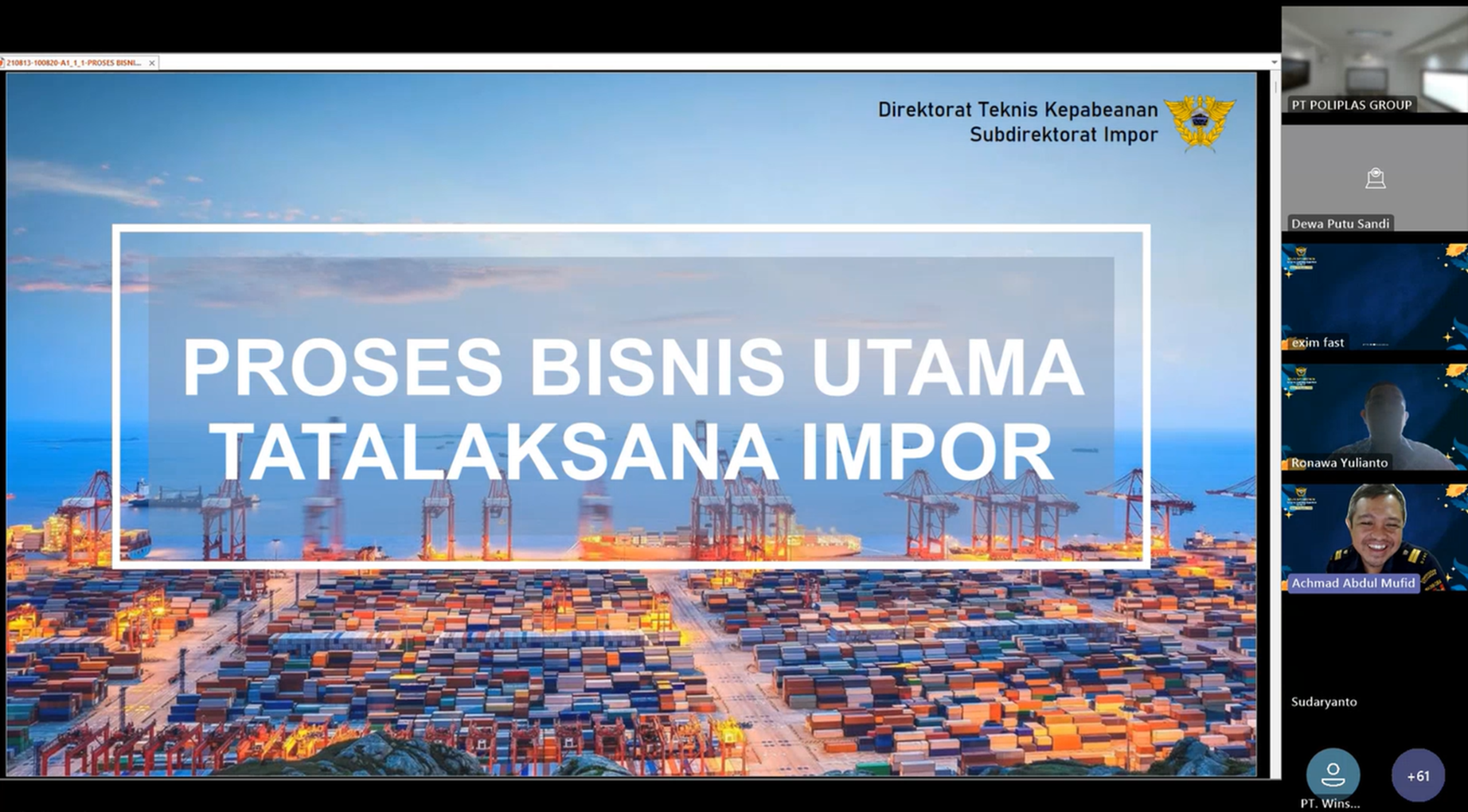 Dalam pemaparannya, Bapak Achmad Abdul Mufid menekankan aspek penting yang diatur dalam undang-undang, antara lain kewajiban pengguna jasa, tata laksana impor-ekspor, serta mekanisme pengawasan kepabeanan. Peserta juga diberi pemahaman terkait proses bisnis impor, mulai dari penyampaian dokumen Pemberitahuan Impor Barang (PIB), pemeriksaan dokumen dan fisik, hingga penerapan manajemen risiko dalam pelayanan.